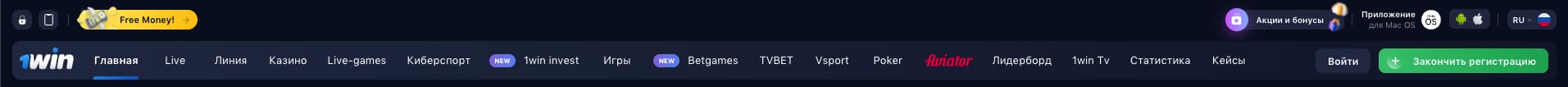 Разработчики уделили особое внимание удобству сайта. Интерфейс выполнен в темно-синих тонах, а меню интуитивно понятное и информативное. Нужный раздел легко найти на главной странице. Навигация проста и понятна, а основные вкладки (Live, Линия, Казино, Live games, Киберспорт, Fantasy Sport, win invest, Игры, BetGames и др.) удобно расположены в верхней части страницы.